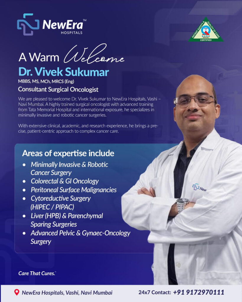 We are delighted to welcome Dr. Vivek Sukumar, Consultant Surgical Oncologist, to NewEra Hospitals, Vashi – Navi Mumbai.